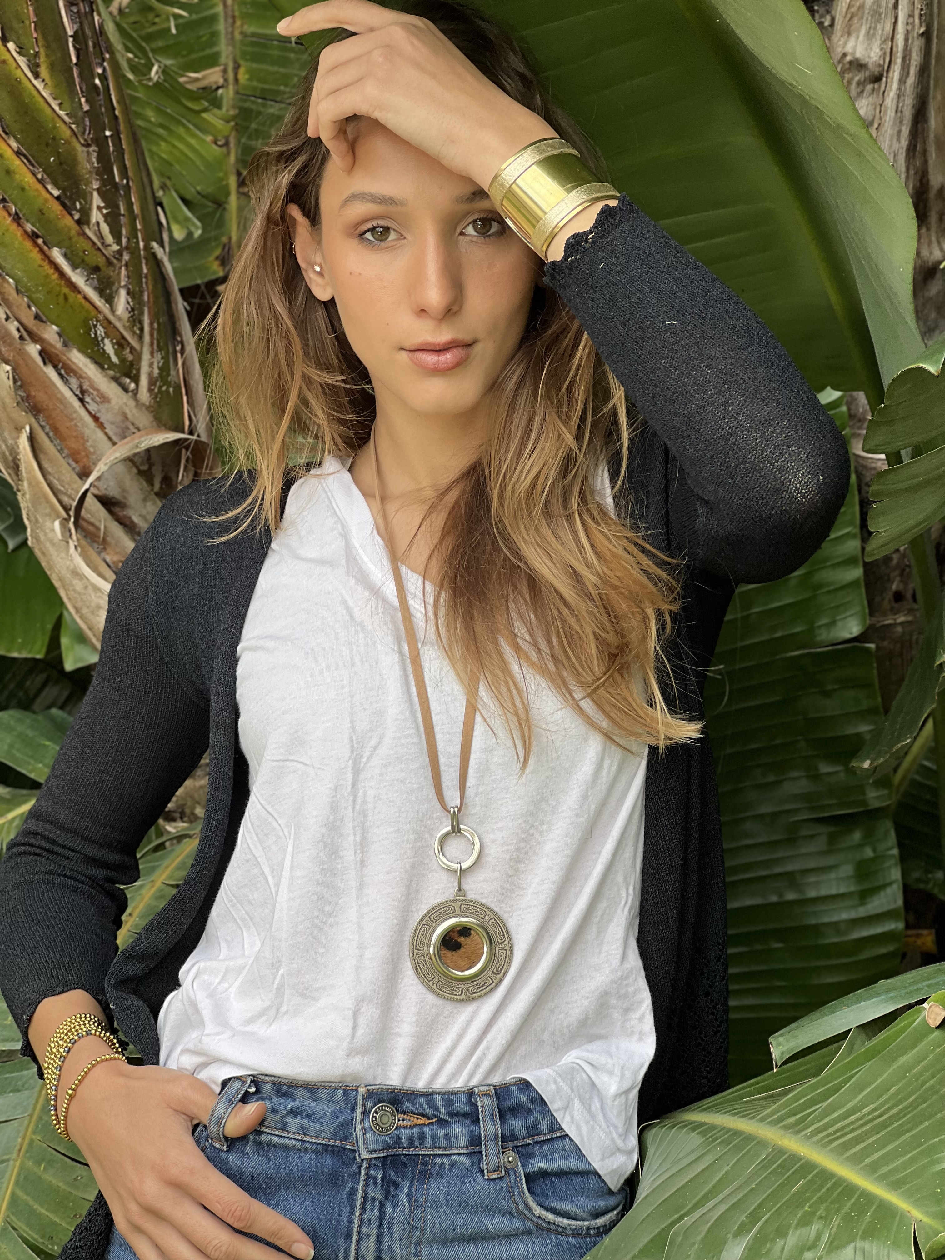 Brazalete de bronce con detalle en cuero natural. Ancho: 5 cm.