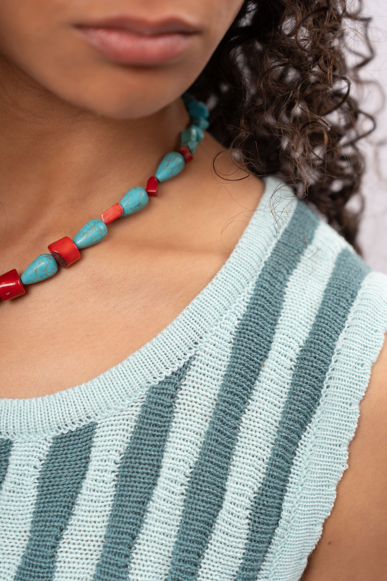 Collar en acero quirúrgico plateado. Piedra reconstruida turquesa y coral natural. Largo 42cm más 8 cm de cadena de extensión.